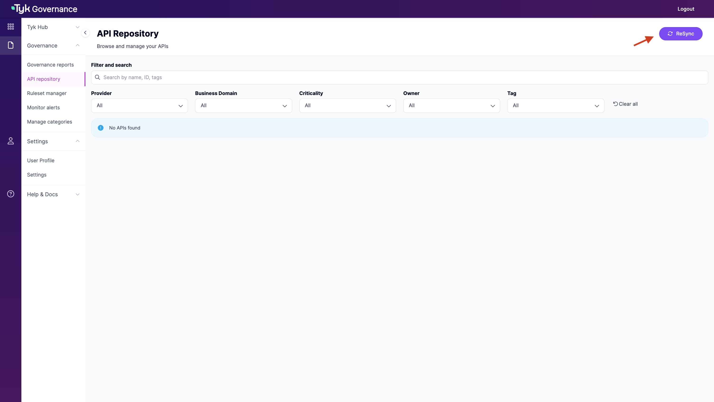 - All APIs from your Tyk Control Plane will be automatically discovered and displayed in the API Repository